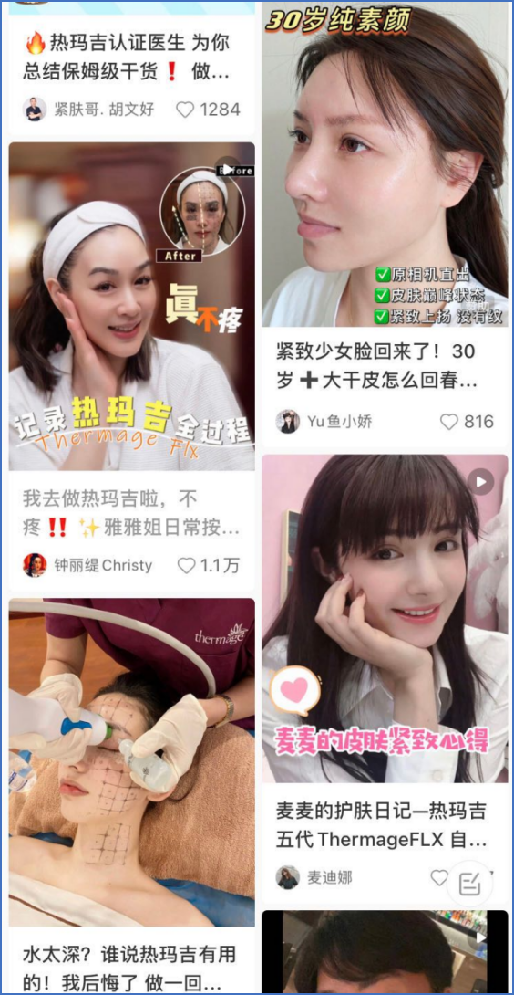 随着“互联网+轻医美”模式的不断普及,更多的人参与到医美服务的营销上来,热玛吉便是这样一个传播的绝佳案例。从虞书欣、伊能静、张雨绮等明星在节目推荐,对消费者进行初步市场教育;社交媒体上的网红、KOL推广,让这款设备进入大众视野。最后,素人在私域分享,让热玛吉更“亲民”。如今在社交平台小红书上搜索“热玛吉”,就有超过9万篇相关笔记。