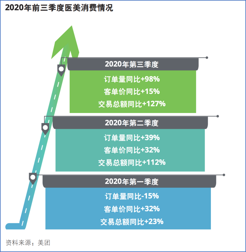 德勤联合美团发布的《中国医美市场趋势洞察报告》印证了周鹏武的说法。根据这份报告,去年第二季度起,医美消费订单量和线上交易额显著增长,客单价相对稳定。2020年第三季度,来自美团的医美消费订单量同比增加98%,客单价同比增加15%,交易总额同比增加127%。