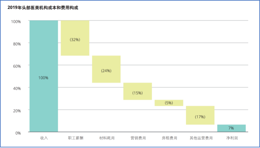 德勤指出,从部分头部医美服务机构的价值分布来看,上游耗材药品成本约占医美服务机构收入的24%,下游营销费用约占医美服务机构收入的15%,扣除人工成本、房租费用和其他运营及管理费用后,头部医美服务机构净利润仅为7%。