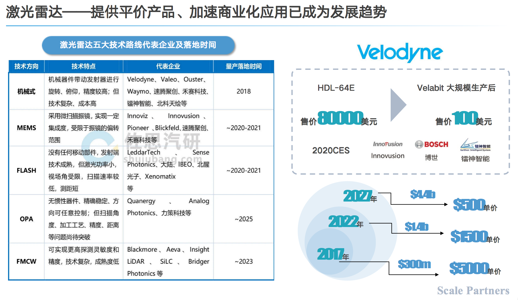 Scale Partners 势乘资本发布的《2021自动驾驶行业报告》就提到,2017年激光雷达单价还要5000美金,但预计2022年,单价1500美金的激光雷达就能够普及。其实2021年以来,包括蔚来、小鹏、北汽等众多车企纷纷推出搭载激光雷达的汽车新品,而根据激光雷达厂商Livox的预测,随着L2/L3级别自动驾驶技术的进一步推广,最终激光雷达成本会降低到100美元以下。