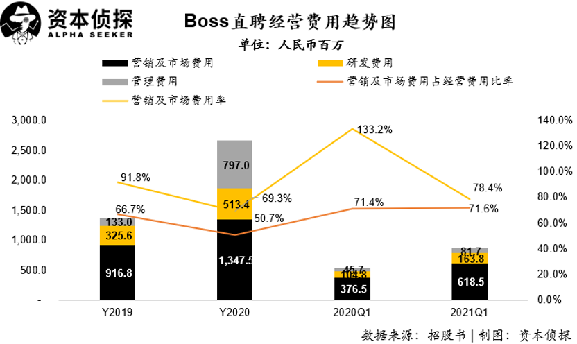 而对于Boss直聘来说,其自身正处于快速扩张期,因此在常规的广告投入外,拉新支出同样占据不小的比重,因此就直接导致营销及市场费用率居高不下。