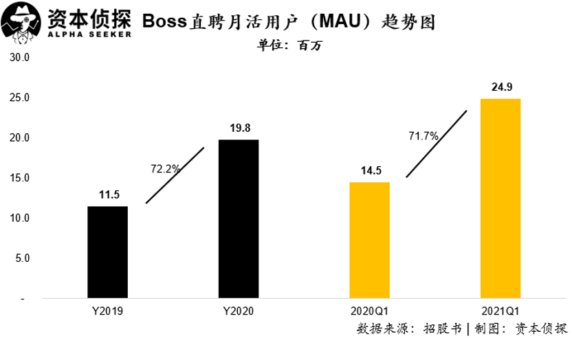用户数方面,BOSS直聘2019年、2020年以及2021年一季度平均月活跃用户数(MAU)分别为1150万、1980万以及2490万,2020年及2021年一季度同比增速分别为72.2%和71.7%。其中,公司的MAU统计口径是包含了找工作用户(C端)以及企业端(B端)用户总和。