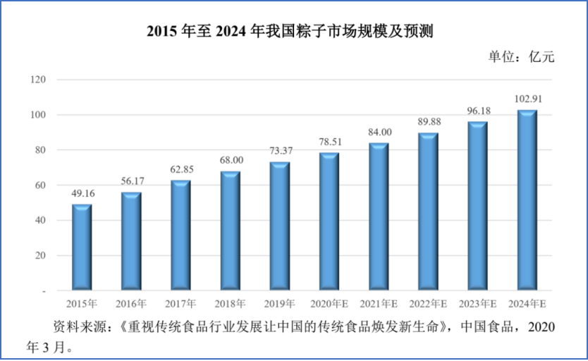 五芳斋招股说明书中披露的数据给出了答案:据统计,2015年我国粽子市场规模为49.16亿元,到2019年增长至73.37亿元,年复合增长率达10.53%。随着传统文化的回归与弘扬,叠加粽子方便食品的属性,预计至2024年,我国粽子市场规模将增长至102.91亿元,2020 年至2024年的年复合增长率预计为7%。