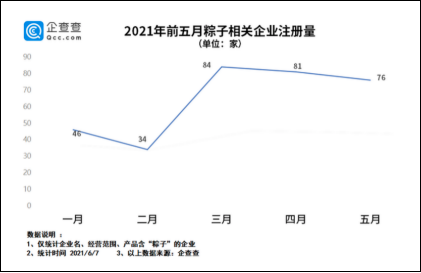 来自企查查的数据显示,从近十年粽子相关企业发展状况来看,粽子企业注册量不断增长,2020年是企业注册的高峰期,全年注册量首次突破一千家,同比上涨7.7%。2021年前5个月,我国粽子企业注册量为321家。