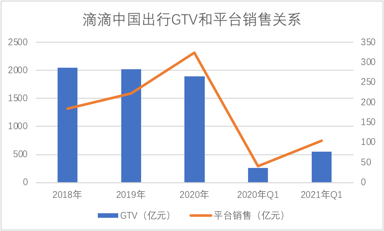 我们整理了滴滴GTV与平台销售(剔除司机收入和奖励,通行费和税金等)之间的关系,见下图
