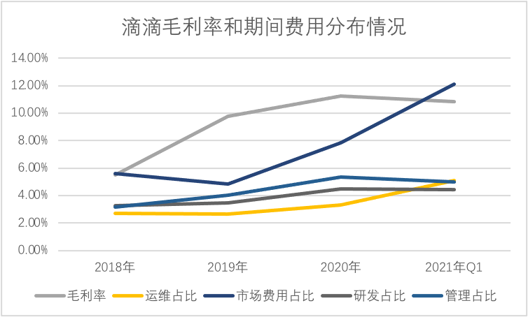其一,毛利率开始有比较明显的上扬,突破10%大关,在2020年Q1改数字更达到了15%之高,彼时正是疫情最为严峻的时刻,联系到成本的构成,当期极有可能因为需求端减少,企业对司机端激励削减导致了毛利率的改善,但2021年Q1仍在毛利率改善周期,说明成本控制的力度并未因为出行的正常而恢复;