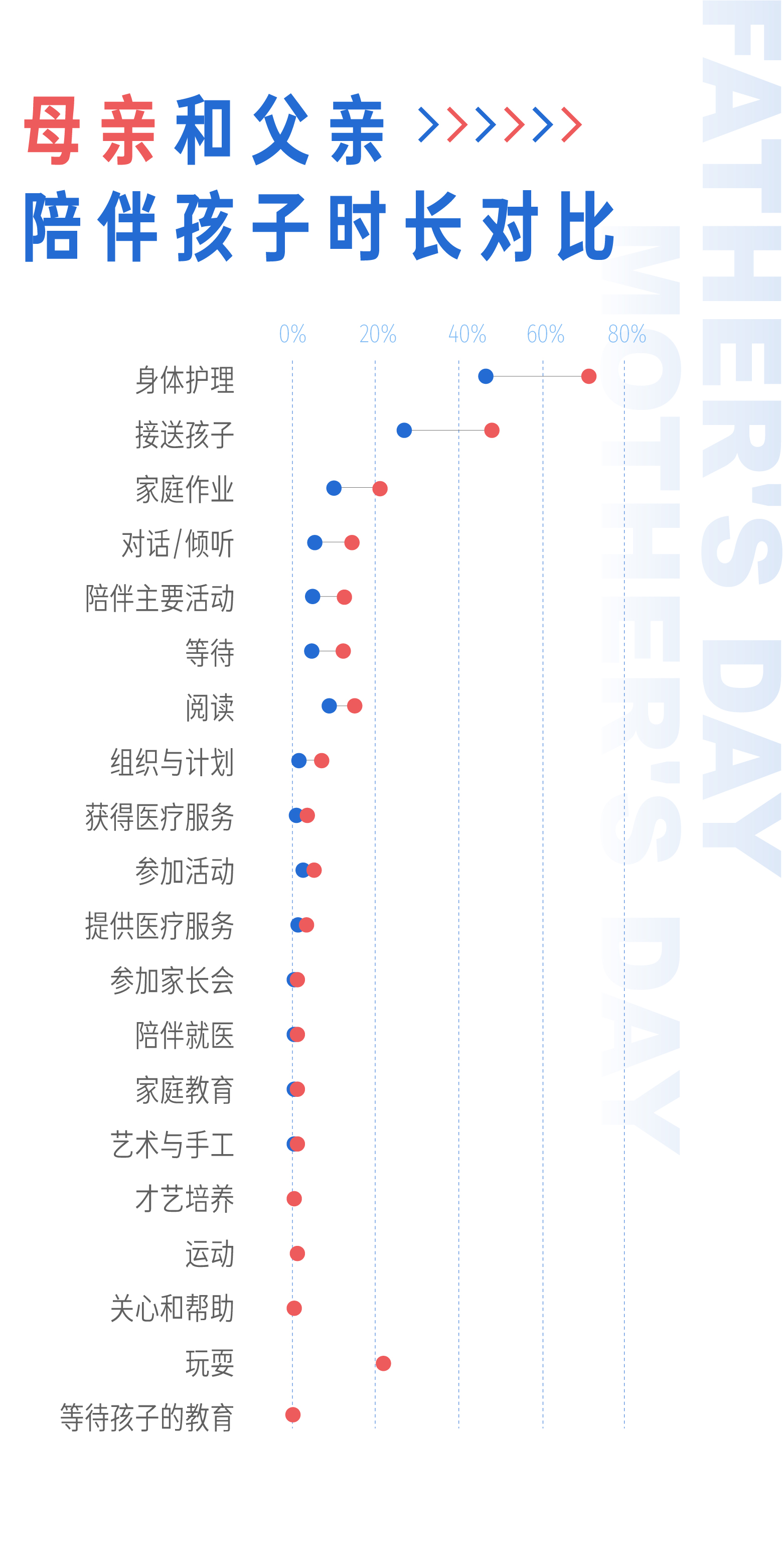 如果你不是对父亲爱的深沉,就是无意中忽视了父亲节,这里也有一组数据可以让你不必太愧疚。American Time Use Survey数据显示,相比母亲,父亲几乎缺席在照顾孩子的各项事务中,对孩子的陪伴时间远也不如母亲。