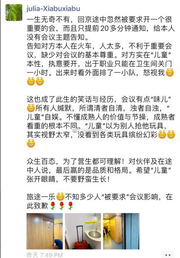 在网上,流传着一份疑似为赵怡被通知开会后的朋友圈发文,该文写到:“告知对方本人在火车,人太多,不利于重要会议,缺少对会议的基本尊重。对方是在‘儿童’本性,执意要开,出于职业只能在卫生间关门一小时……儿童以为别人抢他玩具,其实视野太窄,没看到各类玩具缤纷幻彩。”
