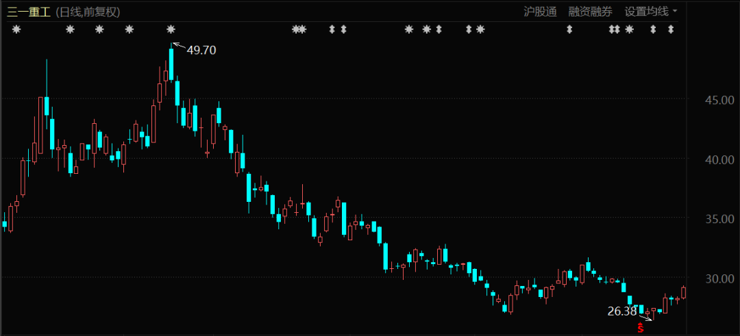 今年以来,三一重工的股价冲高后回落,从顶部的50.3元最低下跌至26.38元,已经接近腰斩。