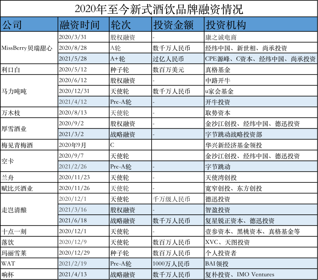不完全统计,从2016年至今,新式酒饮行业内至少15个品牌获得融资,其中冰青完成三轮融资。仅2020年以后,十几家新式酒饮公司已完成23轮融资。其中,MissBerry 贝瑞甜心12个月融资三轮,兰舟、落饮、十点一刻等完成天使轮融资,背后不乏经纬中国、红衫资本、金沙江创投、天使湾创投等投资机构。