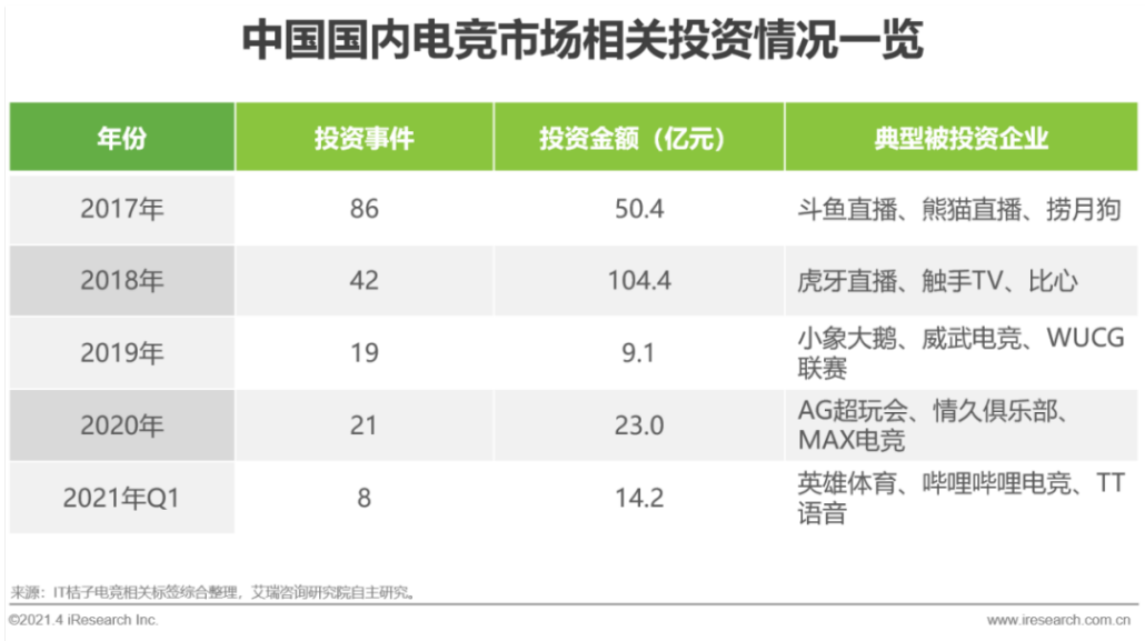 有了政策加码,电竞也逐渐走上了规范与标准化的道路,电竞市场的投资热情又一次被点燃,2021年第一季度,以TT体育为代表的8个投资事件,已经贡献了14.2亿元投资金额,远超2019年全年9.1亿元的投资低谷期水平。