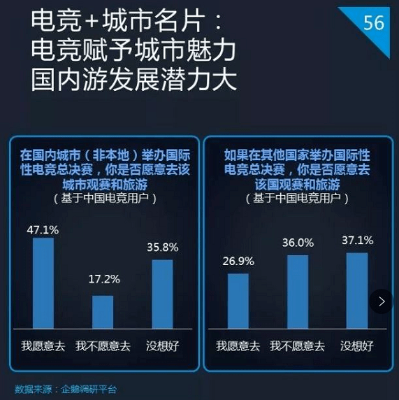 以电竞与旅游业为例,资料显示接近五成的中国电竞用户,愿意就自己的出行理由定为观看电竞赛事和参与电竞活动。