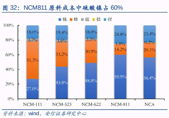 主流三元正极材料NCM523中,镍钴锰的比例分别为43.8%、33.2%、3.6%,高镍三元NCM811为60%、14.2%、1.0%。