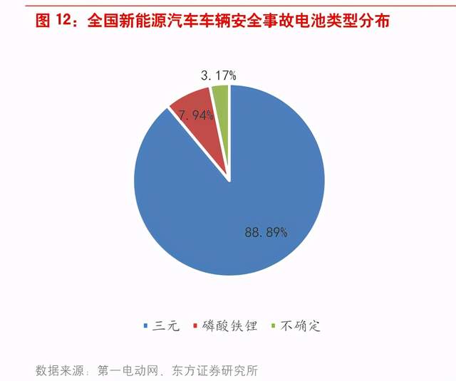 根据新能源汽车国家监测与管理平台的数据显示,尽管新能源汽车的起火事故率为 0.9-1.2 次/万辆,低于燃油车 2-4 次/万辆的水平,但其中有8成安全事故电池系三元电池。