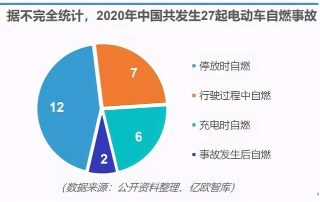 根据亿欧智库,2020年中国一共发生27起电动车自燃事故,包括停放、行驶、充电、发生事故后,其中停放自燃的比重超过了44.4%。