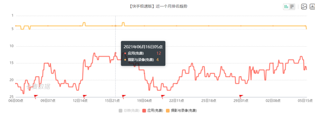 据七麦数据监测,近一个月,快手极速版在App Store摄影与录像(免费)榜单中的排名长期维持在第四,成绩好过快手普通版本。抖音和抖音极速版,则经常盘踞在榜一、榜二位置。