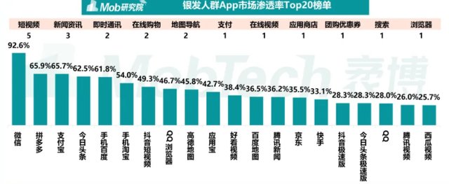 实际使用中,老年用户网上冲浪时更多会选择普通版或者极速版App。Mob研究院发布的《2021年中国银发经济洞察报告》显示,银发人群App市场渗透率TOP20榜单中没有一款是专门的适老版App。