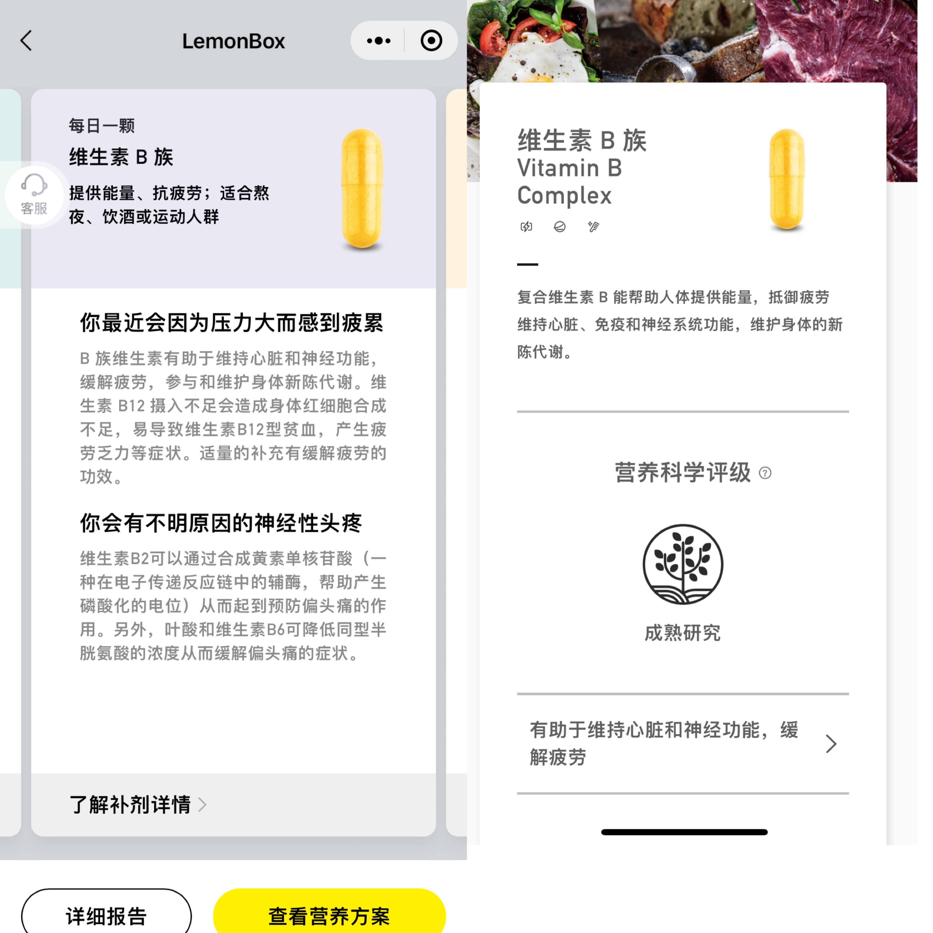 这个过程最有价值的地方或许在于,用户在看似参与一次免费的营养咨询之后被“深度种草”,在问卷结束后的很长时间里,每当他被报告中提到的症状所困扰就会想起对应的产品推荐:“最近工作好累,或许我应该试试吃维生素B了。”也是借由这样双向奔赴型种草,LemonBox实现了品牌的用户心智教育。