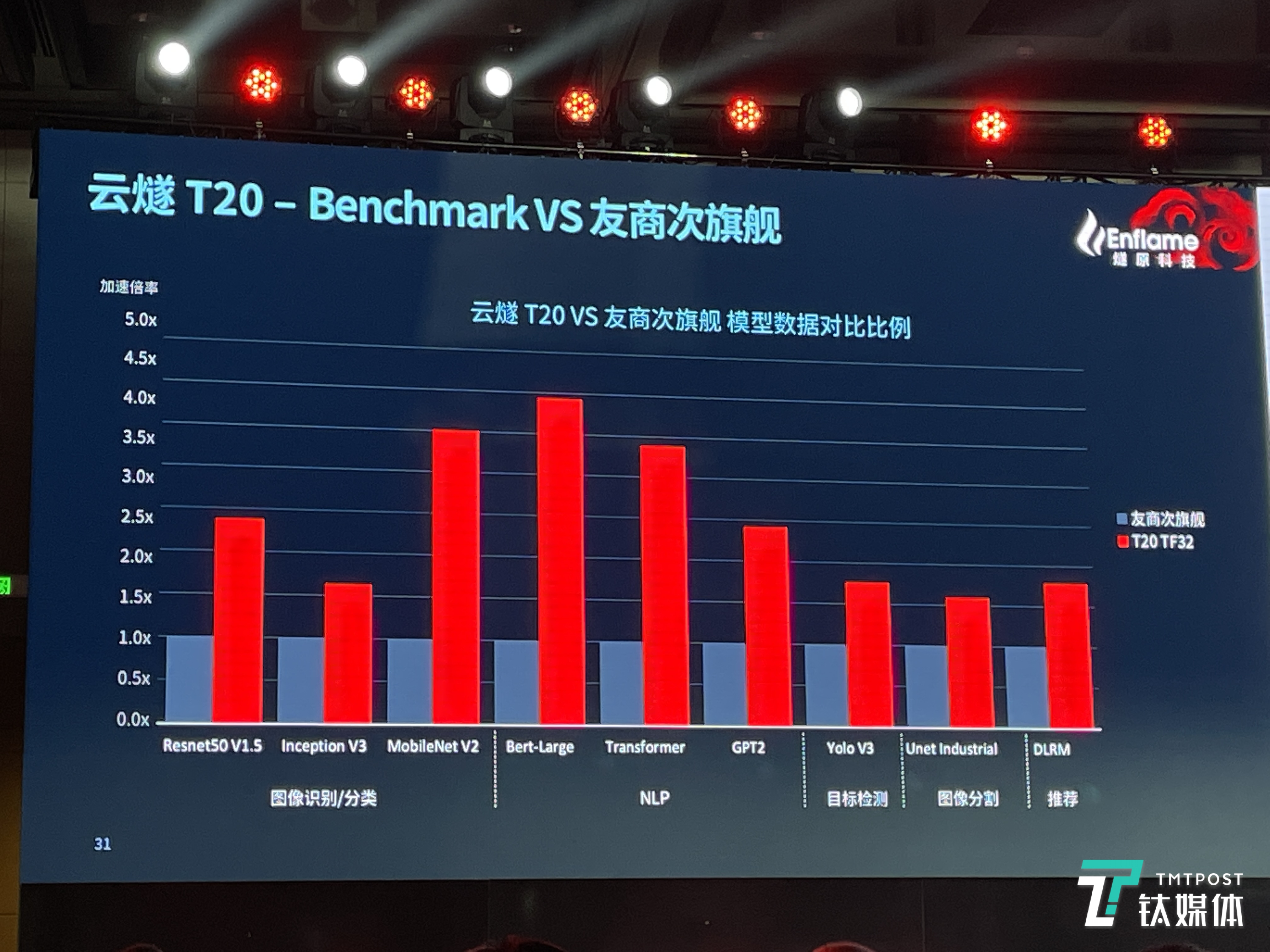 在发布会上,燧原科技COO张亚林展示了T20与友商(英伟达V100、A100)的Benchmark对比跑分。