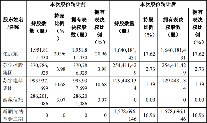 根据公告,虽然张近东仍然保住了第一大股位置,但在本次股份转让完成后,苏宁易购将处于无控股股东、无实际控制人状态。