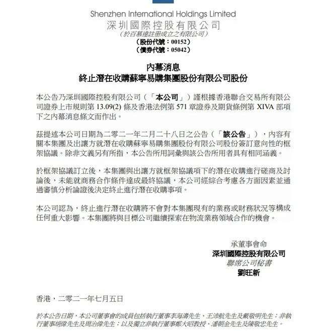 不出意料,苏宁易购公告前一天,深国际宣布,终止入股苏宁易购。