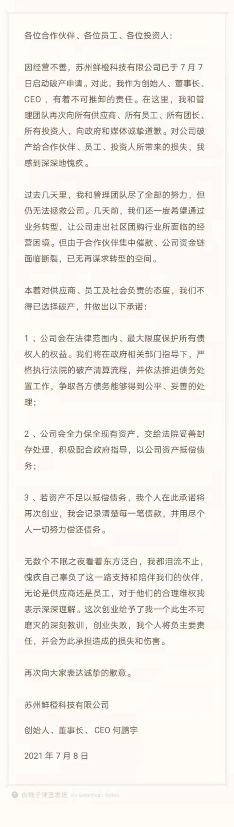钛媒体快讯|7月8日消息:今日,针对同程生活启动破产申请一事,其主体运营公司——苏州鲜橙科技有限公司(下称“鲜橙科技”)创始人、董事长兼CEO何鹏宇再发公开信,向所有供应商、员工、投资人等致歉。