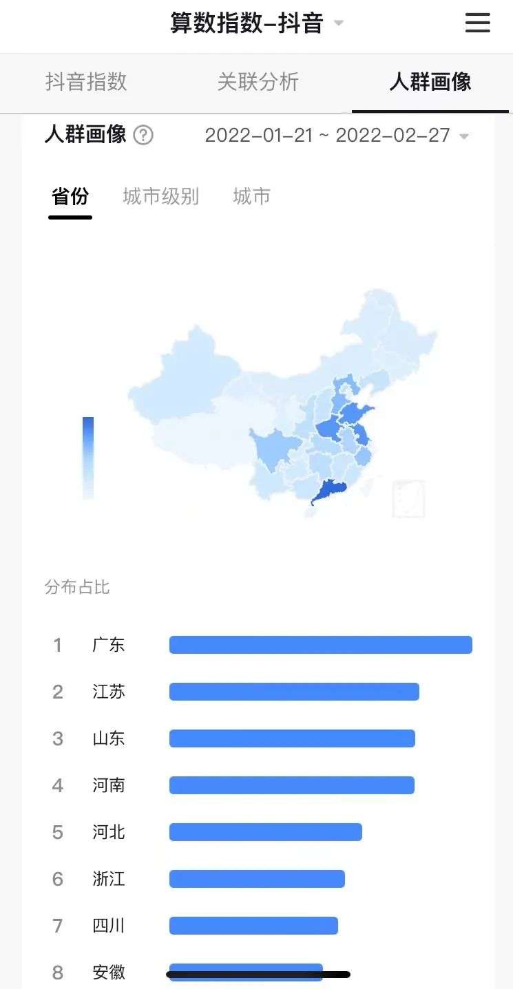 冬奥会开在北京,但最活跃的用户在广东。根据字节跳动旗下巨量算数平台显示,冬奥会期间,冰雪运动相关人群画像中,最热门的省份是广东,其次是江苏、山东等地。