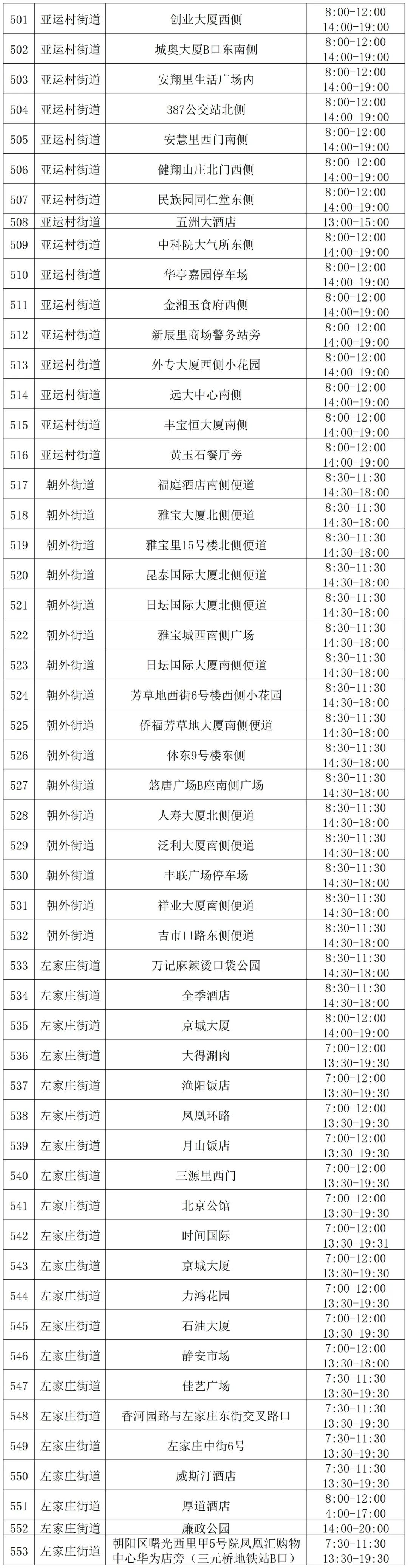 38 | 杨庄街道 | 京贸国际小区东北角 | 9:00-11:00 |
