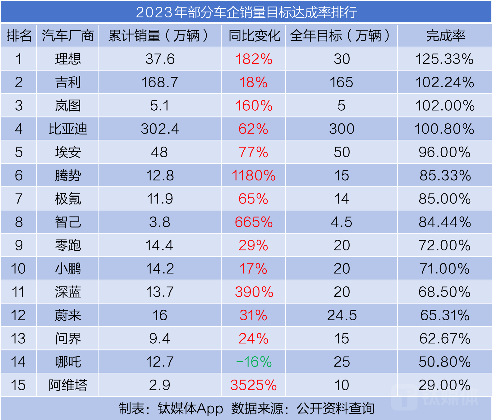钛媒体App统计了15家车企的年度目标完成率,其中仅4家完成了年度目标。其中,理想汽车全年销量达37.6万辆,目标完成率超过125%;吉利汽车全年销量达168.7万辆,与年初定下的165万辆年度目标相比,目标完成率达到102%;比亚迪的全年目标为300万辆,最终完成了302.4万辆,目标达成率为100.8%;最后一个达成年度目标的车企是岚图,其目标达成率为102%。但岚图全年只销售了5.1万辆新车,是完成目标车企中销量最低的一个。