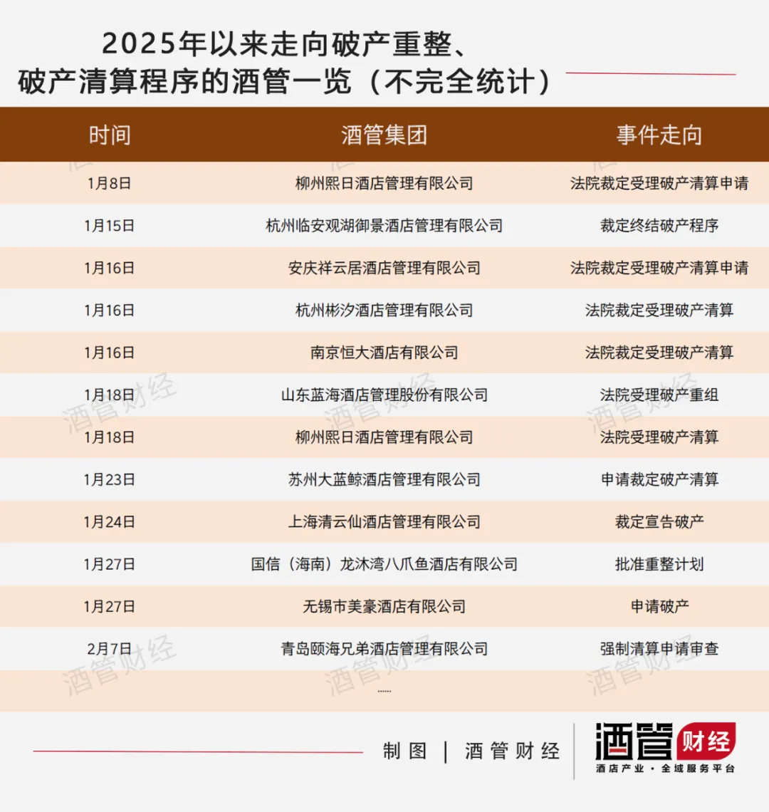 根据《酒管财经》不完全统计,进入2025年,接近20家酒管集团进入破产重整、破产清算程序。另据天眼查信息显示,以“酒店管理”为关键词检索,涉及破产案件的信息为1360条。自2025年以来,有42条。