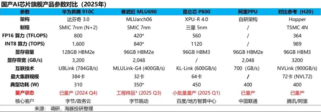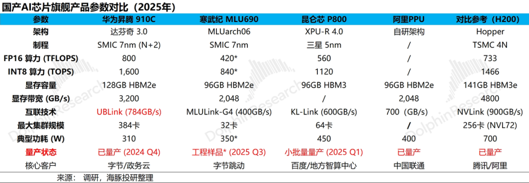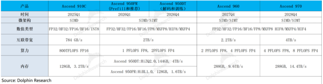 在路线图演进上能看到和H200竞争的,要等到华为下一代950芯片(适用于FP8)会是首款能用到训练上,同时内存配置、卡间互联和集群能力都比较强的国产芯片。