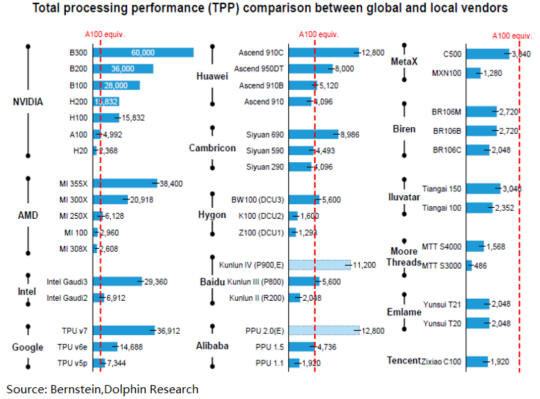 二年的硬件产品差距,对于当前下游模型以半年为期来迭代的速度还是有些差距,也因此,有传国内一些前沿的模型会去海外训练再回传。
