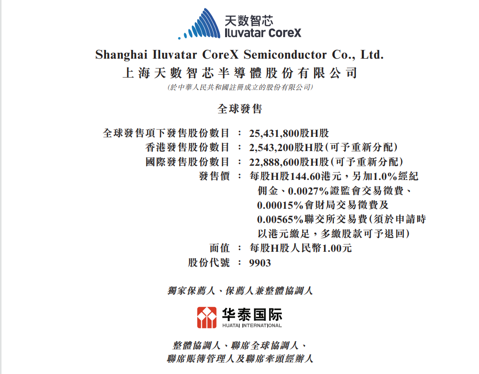 据公告,天数智芯招股期从12月30日至1月5日,拟全球发售2543万股。其中香港公开发售占10%,其余为国际配售。公司预计H股将于2026年1月8日开始买卖。以144.60港元的发行价计算,天数智芯此次IPO市值将达354.42亿港元。