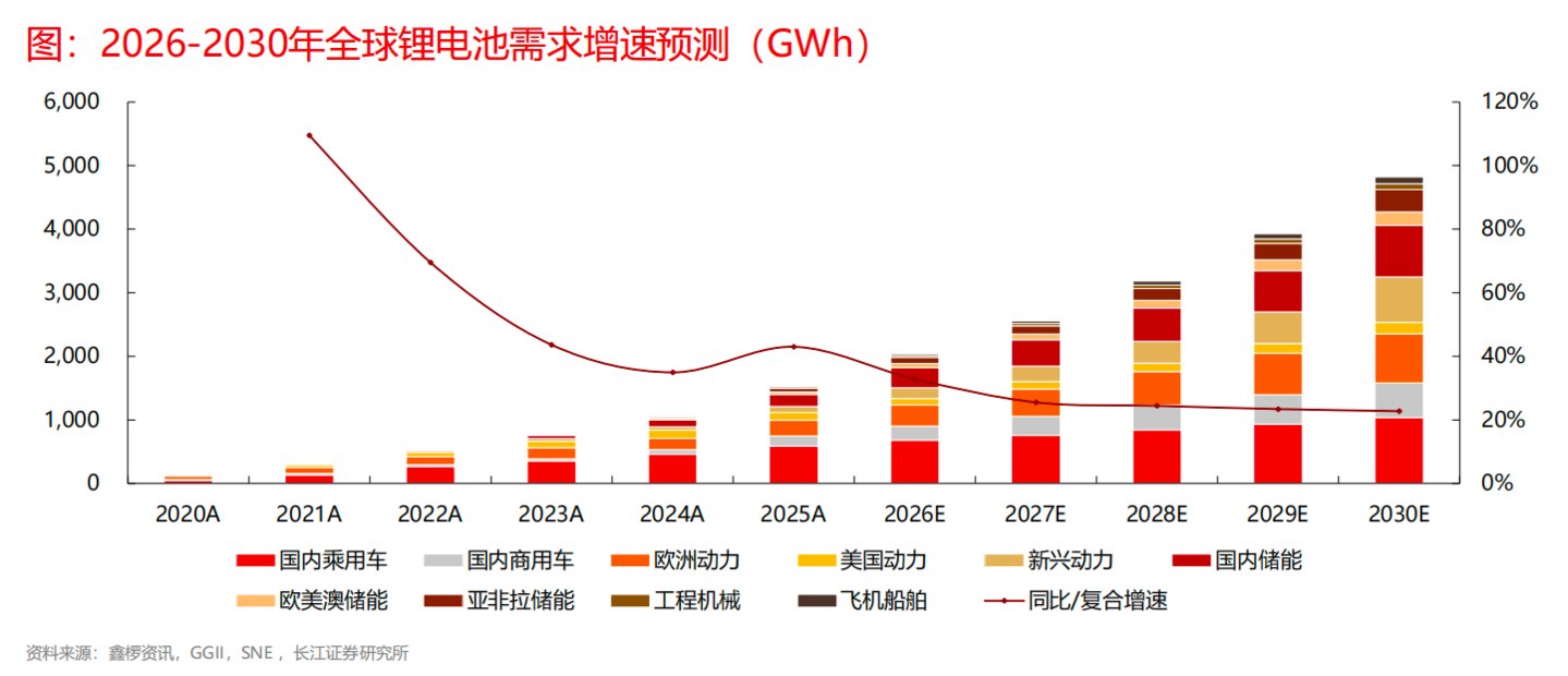 基于此,长江证券全面上修锂电的需求增速预期,2026年预计行业增速将超过35%,其中储能达到50%-60%,动力接近25%;2027-2030年的复合增速预计也将接近25%,其中储能接近30%,动力维持20%以上。
