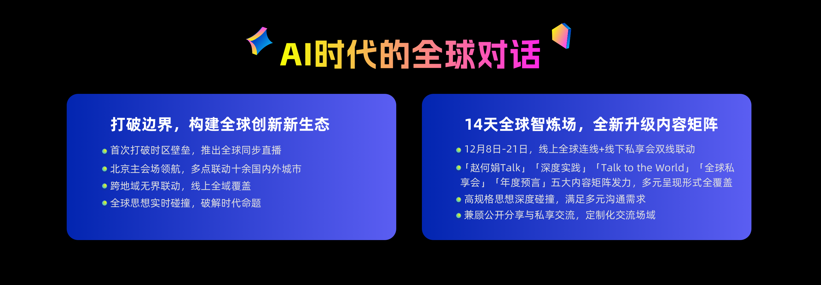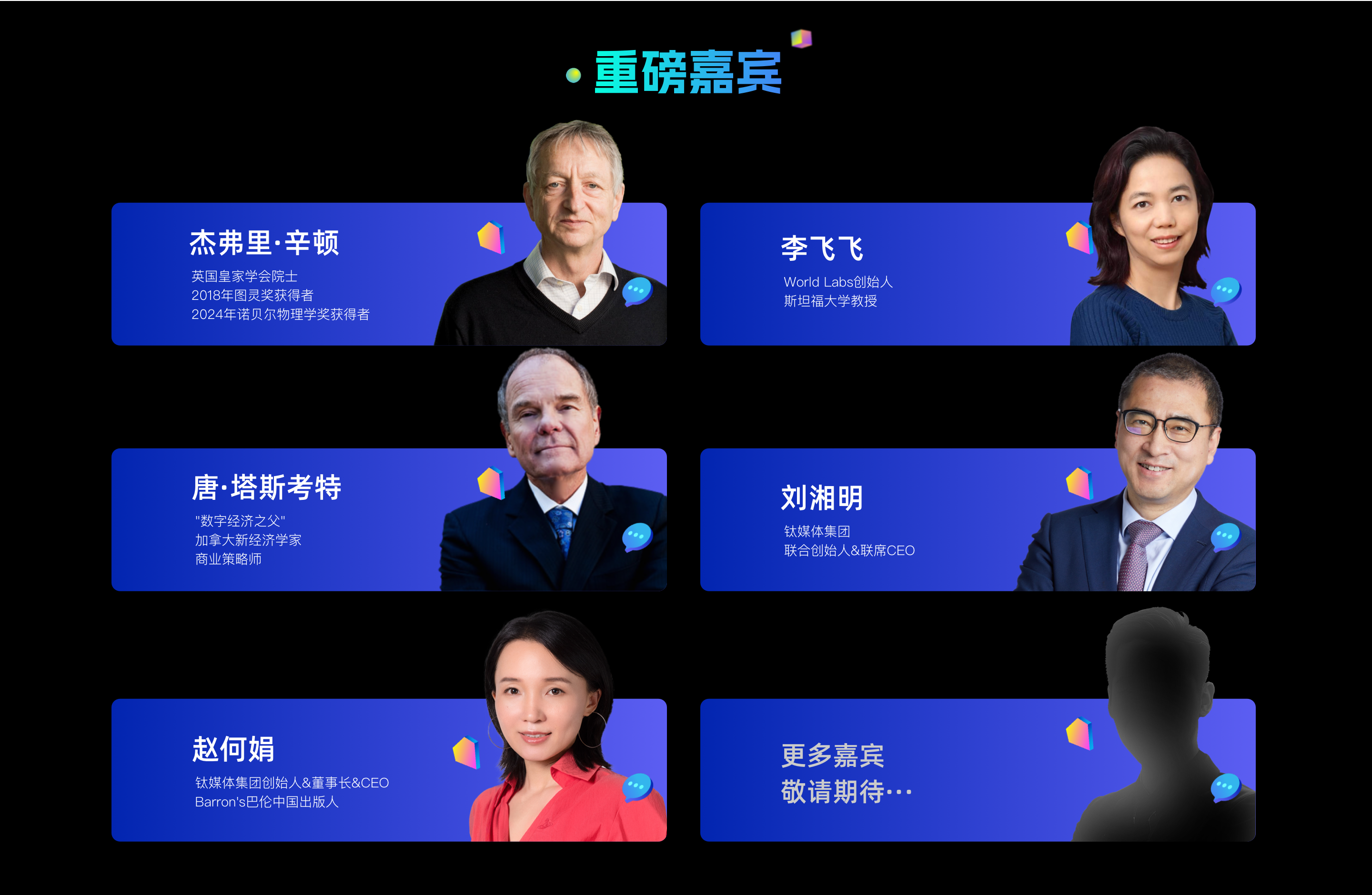 - 8 /12开幕日: AI Blooming Era【赵何娟Talk】人类如何与AI共存12:00-13:00对话嘉宾:杰弗里·辛顿 | 英国皇家学会院士、2018年图灵奖获得者、2024年诺贝尔物理学奖获得者主持嘉宾:赵何娟 | 钛媒体创始人&董事长&CEO、Barron's巴伦中国出版人12345678
